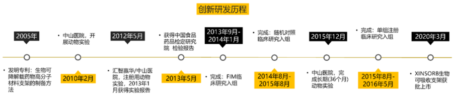 2005年,研發團隊獲得了關鍵性專利:生物可降解載藥物高分子材料支架的制備方法。其后,通過反復對材料配方進行優化、原型迭代,于2010年2月開始在中山醫院開展臨床前評價。2013年5月正式獲得中國食品藥品檢定研究院檢驗報告,可以開展臨床研究。